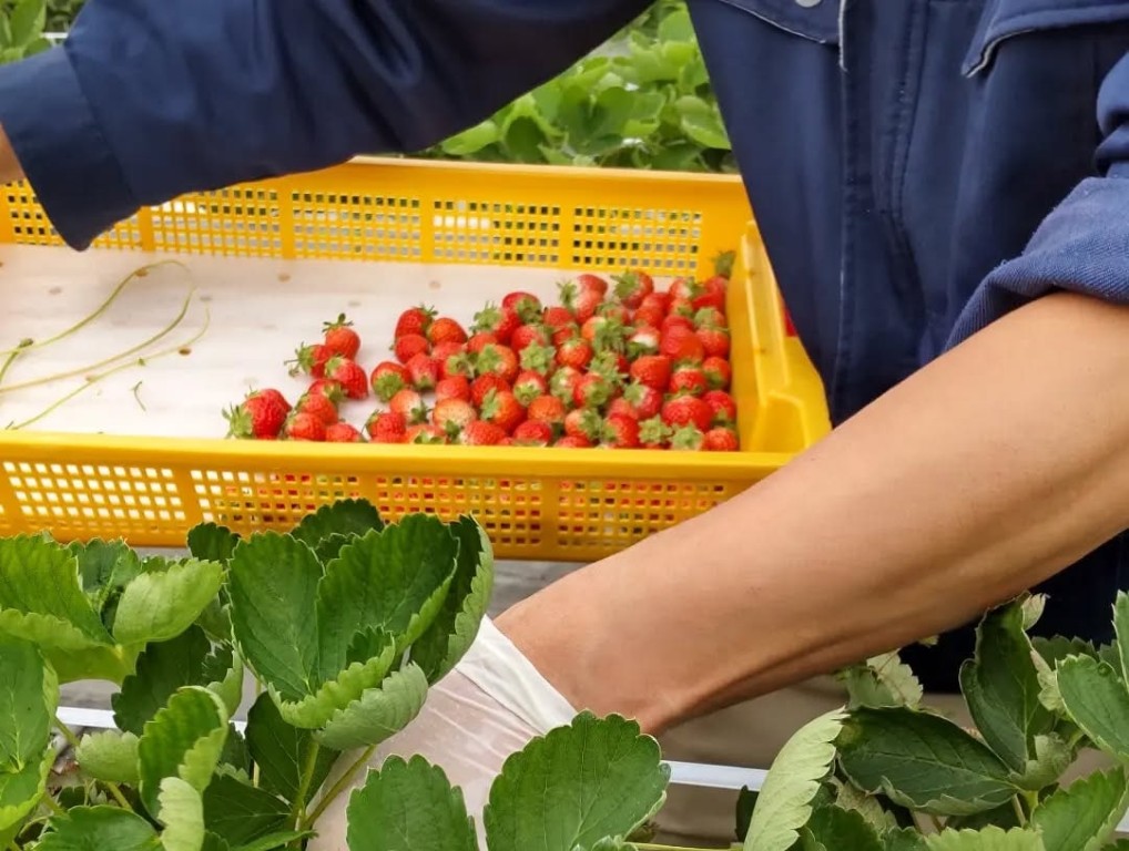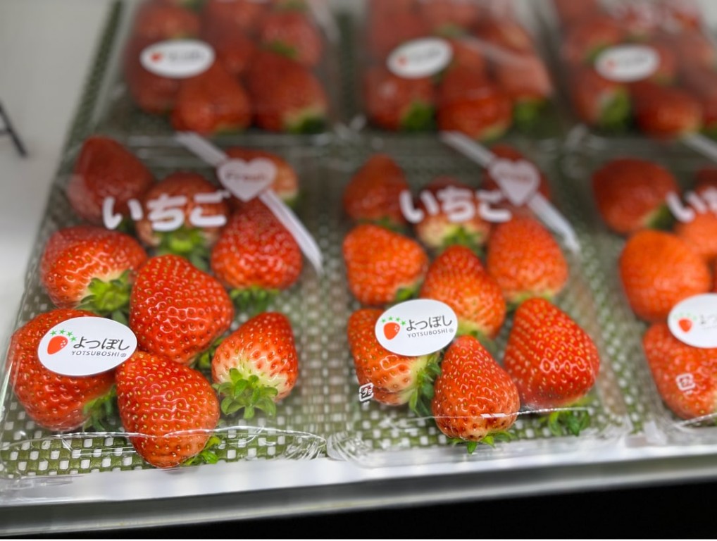 冬春は見た目も美しく濃厚な食味の「よつぼし」、夏秋は輸送性・日持ちも良く爽やかな食味の「夏のしずく」を栽培しています。 自社のスマート農業技術を活用したハウスで、イチゴの生育をコントロールすることで通年栽培を実現しています。