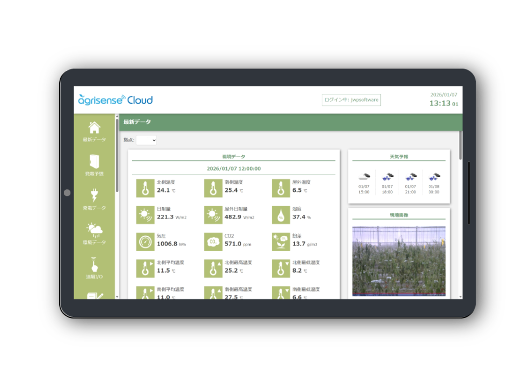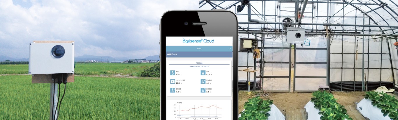 あぐりセンスクラウドは、施設園芸や露地栽培の環境計測に最適なクラウド対応の環境モニタリングシステムです。 各種センサーや定点カメラ、LTE通信機能を内蔵したセンサーボックスを圃場に設置して電源に繋げば、すぐに環境計測が始められます。